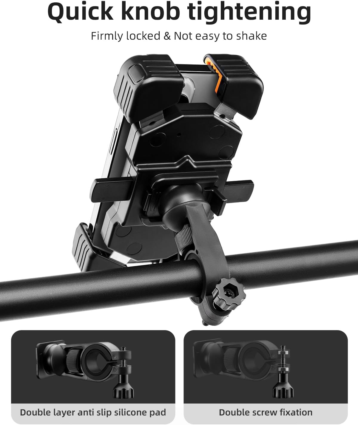 360° Adjustable: Our bike cell phone holder features a universal rotating ball design, allowing easy one-handed adjustment. Simply tighten the bottom knob after adjustment. It meets all your needs, such as GPS/have calling/listen music/charging.
