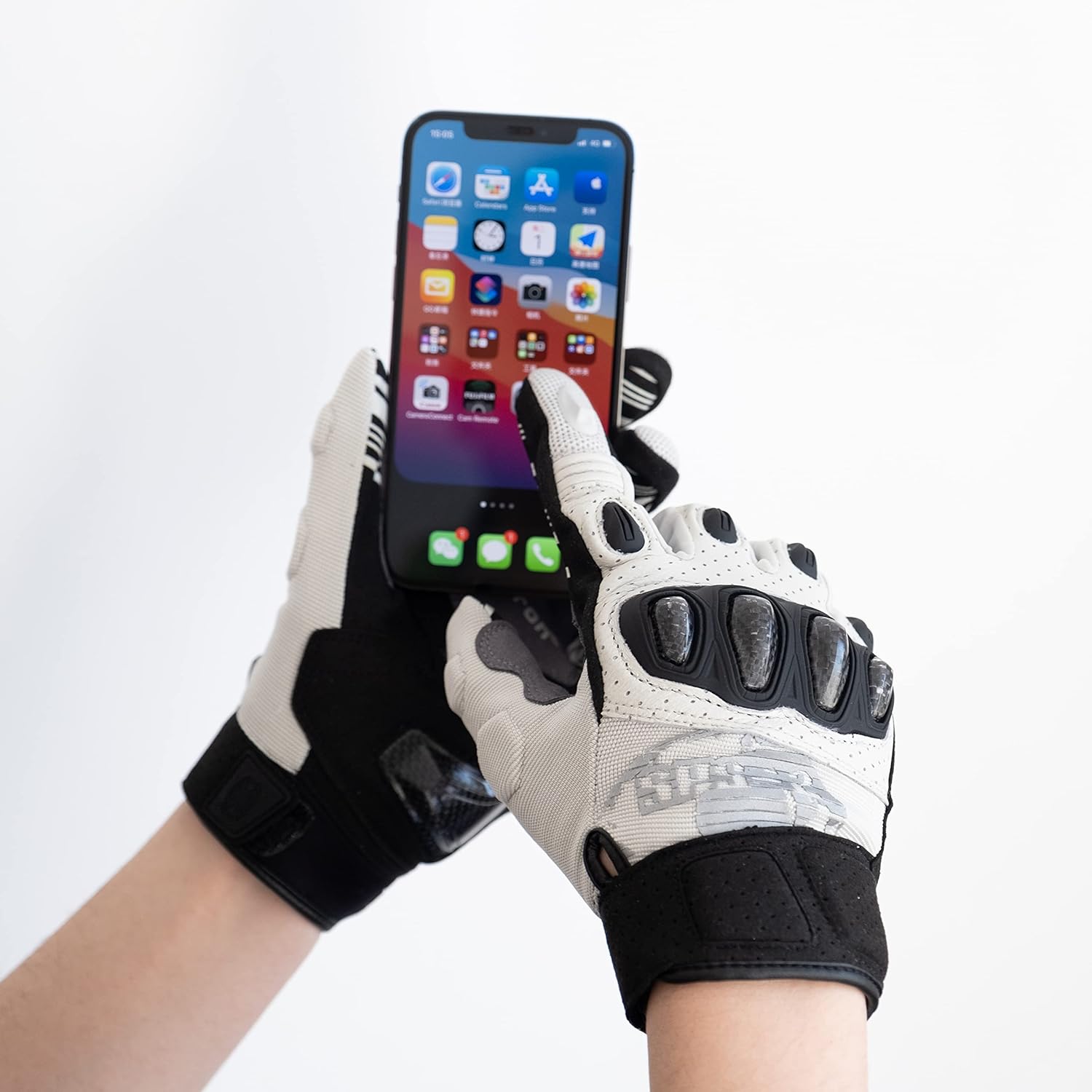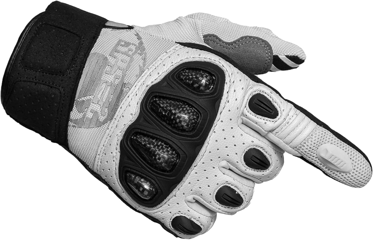 Anti-slip print on the upper palm and fingers for slip resistant ability; New hook and loop closure with TPR rubber on the wrist for perfect secure fit; Touchscreen sensitive on both index finger tips; Perforated goatskin leather on back of hand for maximum breathability