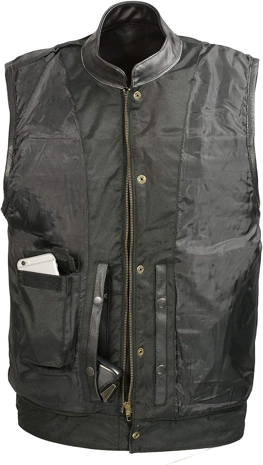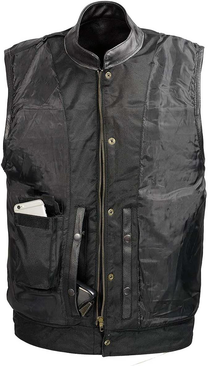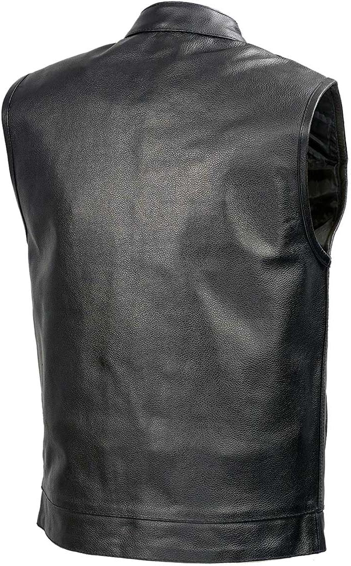 SOA Mens Leather Club Style Vest W/Concealed Gun Pockets, Cowhide Leather Biker Vest, Single Panel Back (Black XL)