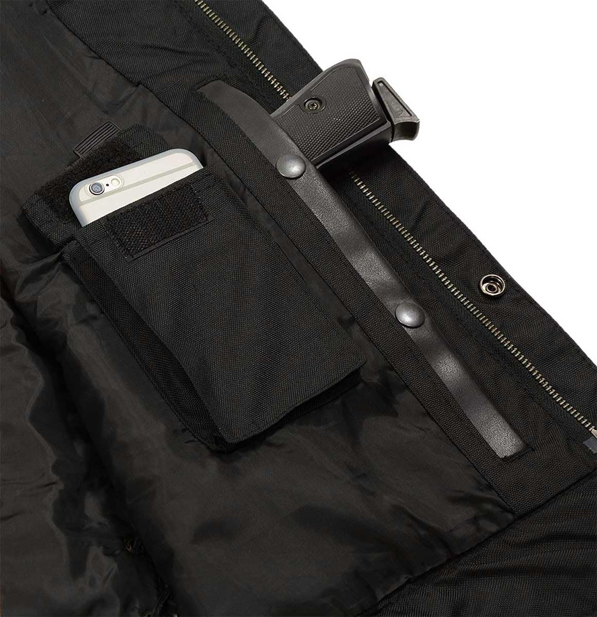 GUN POCKETS: Built in Dual Side Concealed Weapon & Ammo Pocket — OTHER POCKETS: Two Lower Hand Warmer Pockets Two Chest Pockets One w/ Sunglass Holder Slit