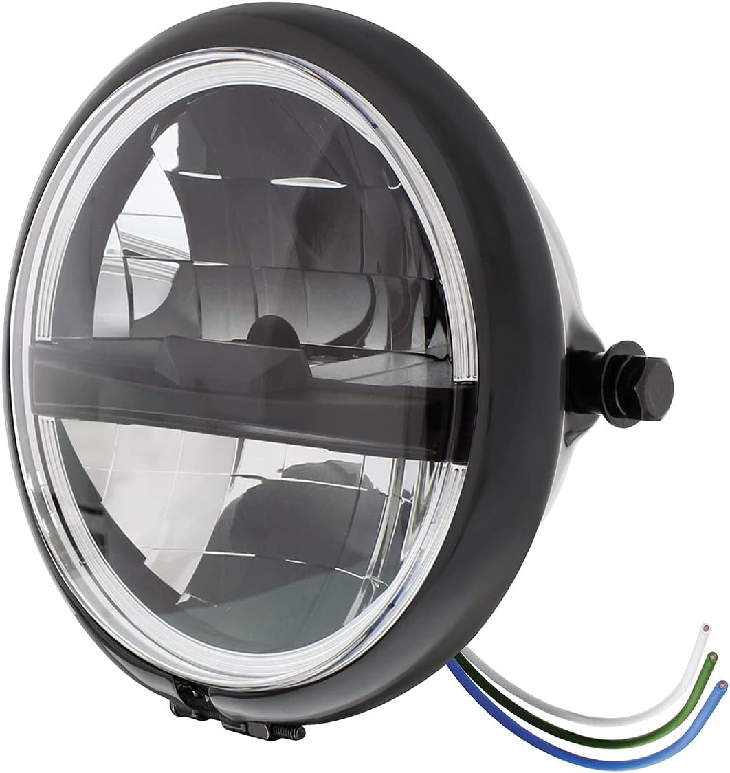 Gloss black powder coated steel outer retaining ring and housing. Threaded side mounting holes for fork mounted headlight brackets. High power LED headlight with 1,020 lumens output on low and 1,600 lumens output on high. Crystal clear lens with black painted center accent bar. Pre-wired from inside the housing, simply connect the 3 wires out of the housing.