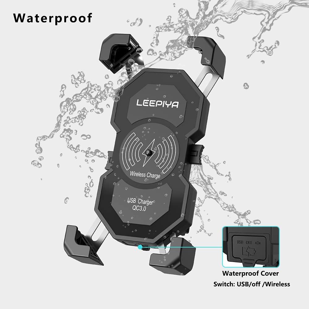 Upgraded Leepiya Motorcycle Phone Mount with Wireless and USB Charger 15W Qi Fast Charging Cell Phone Holder for Motorcycle ATV Boat Snowmobile Compatible with iPhone 12 11 Xs MAX XR X 8 8P Samsung