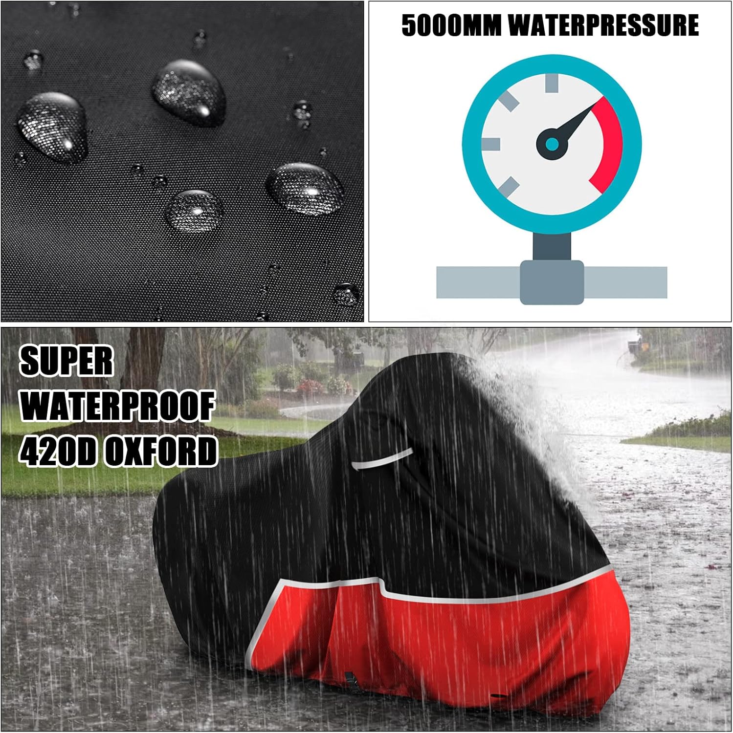 Heavy Duty Material: 1: This All Weather Motorcycle Cover made of Black 420D Oxford Fabric and Red 300D Oxford Fabric, Can withstands summer sun exposure and winter rain/snow (Waterproof pressure up to 5000mm). 2: High reflective aluminum is good at sunproof. 3. Inner upgrade black PU coating not only increase its tear strength, but Great Sun Protection function, Lower the temperature on the Motorcycle in summer