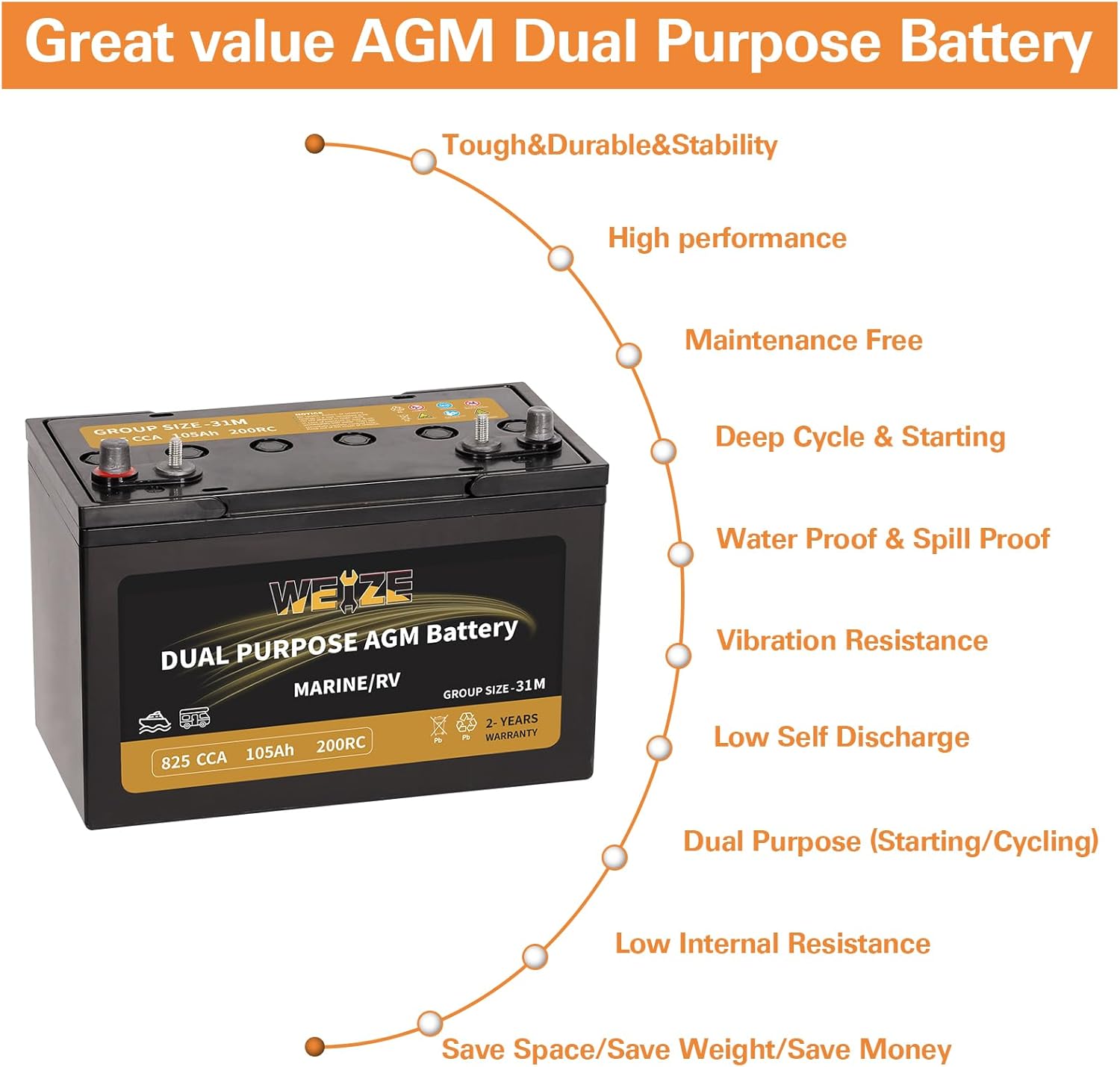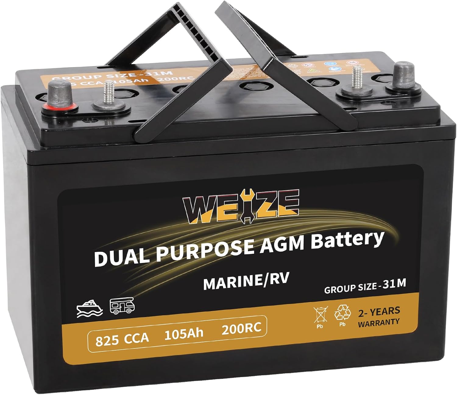 Weize BCI Group 31M Dual Purpose AGM Battery, 200RC 825CCA 12V 105AH Starter & Deep Cycle Sealed Marine & RV Battery