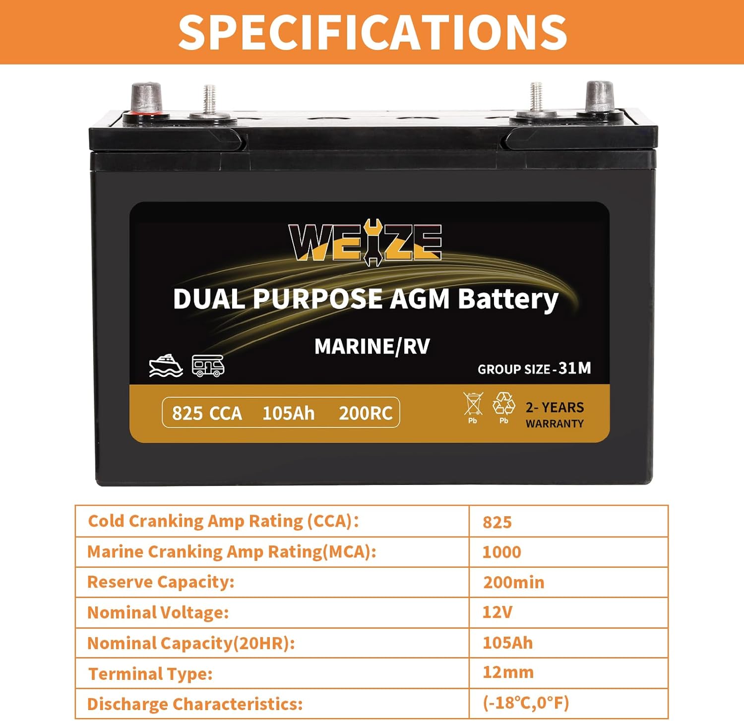 [DUAL PURPOSE]: The WEIZE BCI Group 31M is a dual purpose deep cycle sealed AGM marine and RV battery. It features an outstanding starting power and deep cycling capability for long-lasting power supply. Terminal: Left : Positive (+)-Red, Right: Negative (-)-Black.
