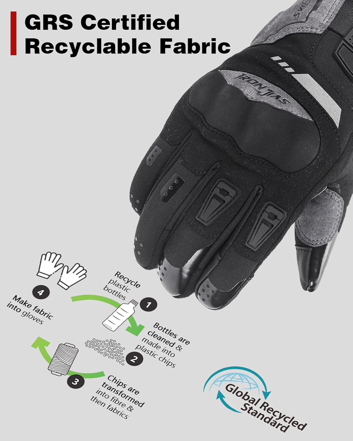 ECO-FRIENDLY FABRIC WINTER MOTORCYCLE GLOVES – We pay attention to the environment protection responsibility, so 30% global standard recycle fabrics are used in this pair of winter motorcycle gloves, and we give a new life to the discard plastic bottles.
