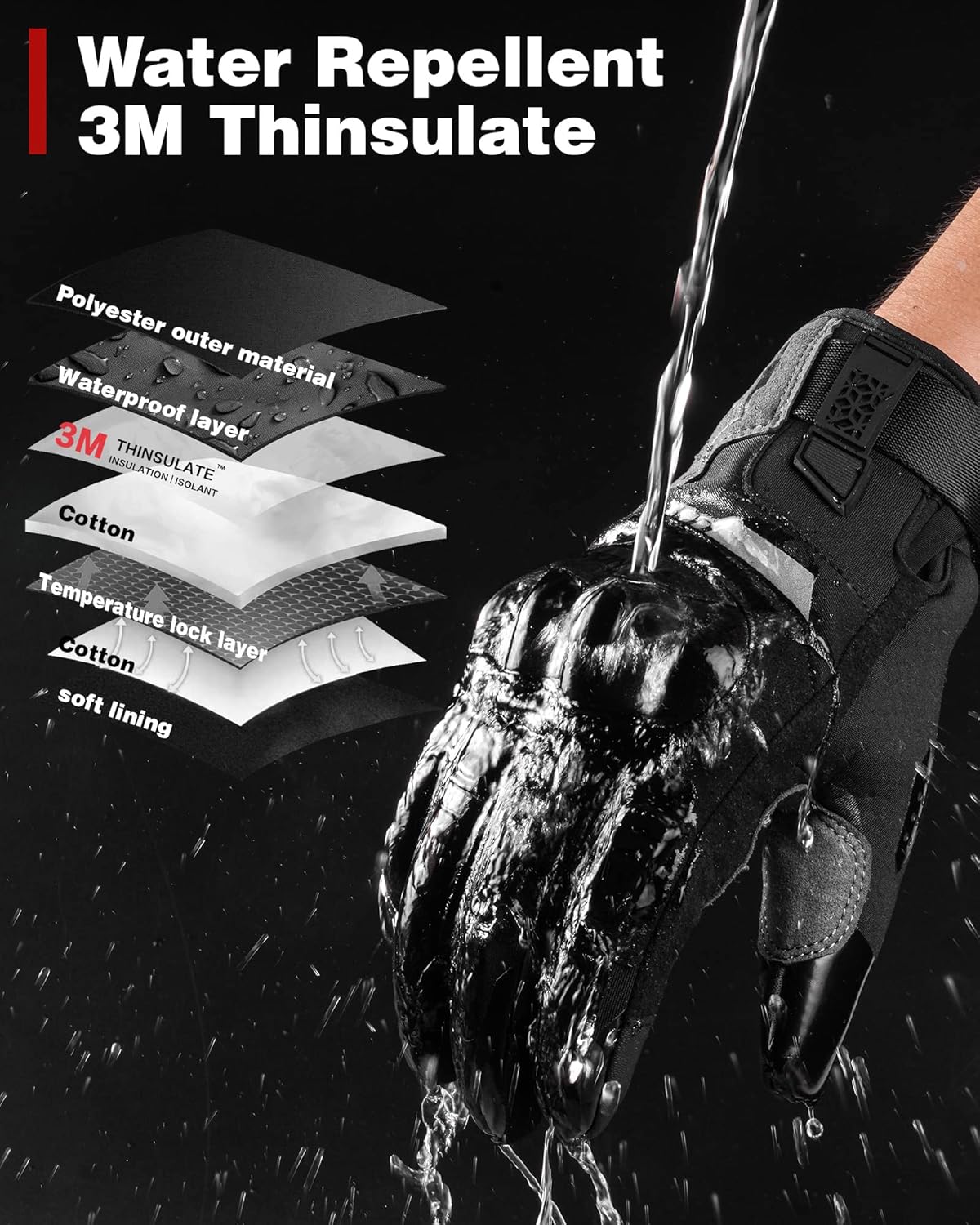 3M INSULATION & WEATHER-PROTECTION – This winter motorcycle riding gloves performance to insulate against the cold weather and water. With a regular cuff and integrate a 3M Thinsulate insulate layer, waterproof membrane layer and velvet inner thermal lining, which keep your hands warm, comfort and dry while riding in winter. The adjustable cuffs with Velcro blocks wind from getting into your jacket at the wrists.