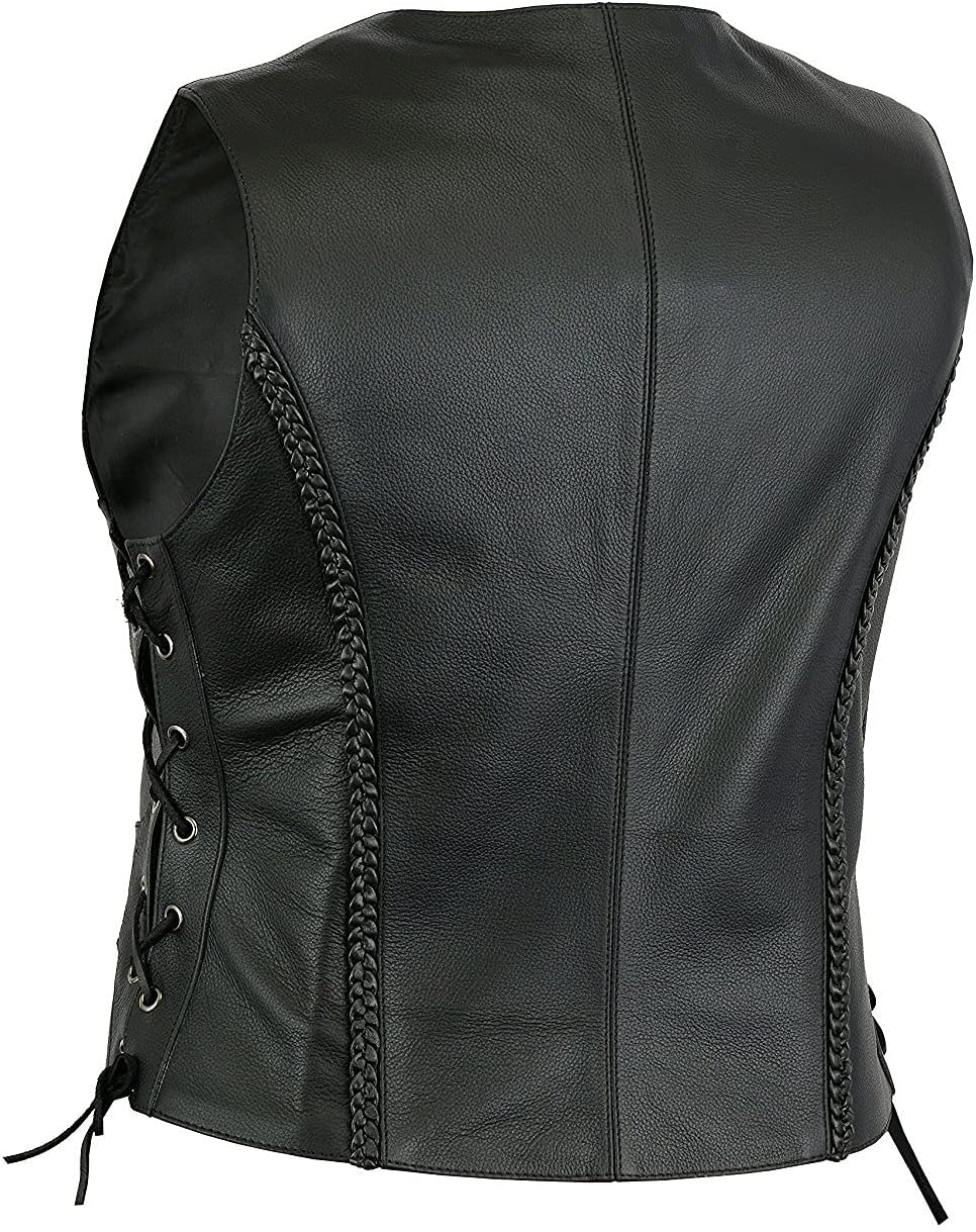EXCELSIOR INT WOMEN’S CONCEALED CARRY SLEEVELESS LEATHER VEST WITH FRONT AND BACK BRAID SIDE LACES MOTORCYCLE RIDER JACKET FOR WOMENS