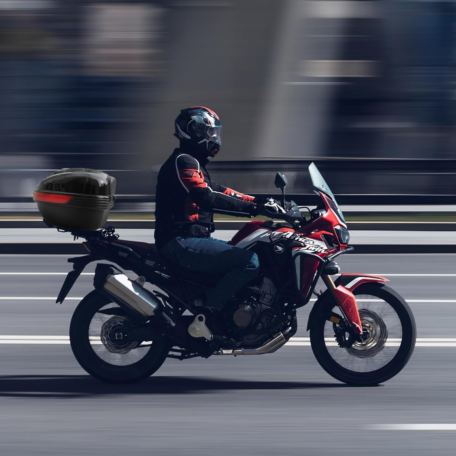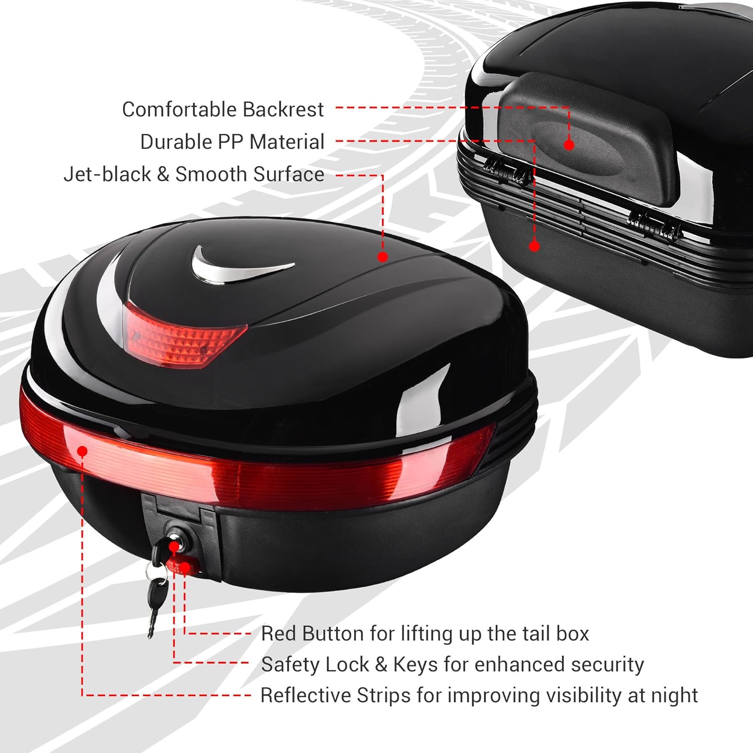 – 35L Large Capacity – 17″ x 15″ x 11″ Motorcycle Tour Tail Box features 35L large storage capacity for easy holding 1pc helmet including full face helmets or half face helmets, also allowing you to keep your raincoats, bags, water bottles, motorcycle covers, laptops, cameras, motorcycle repair tools, etc., suitable for commuters or travelers