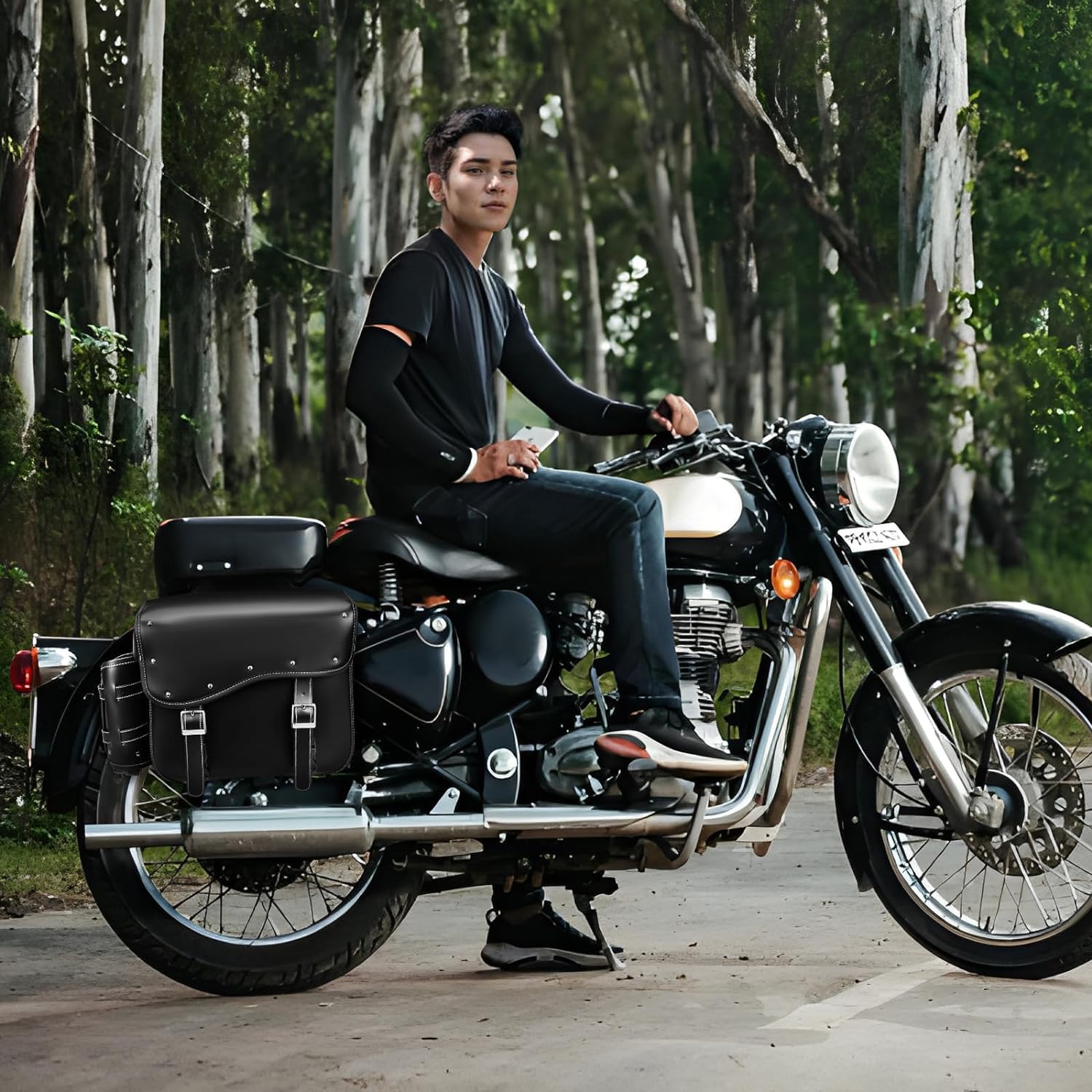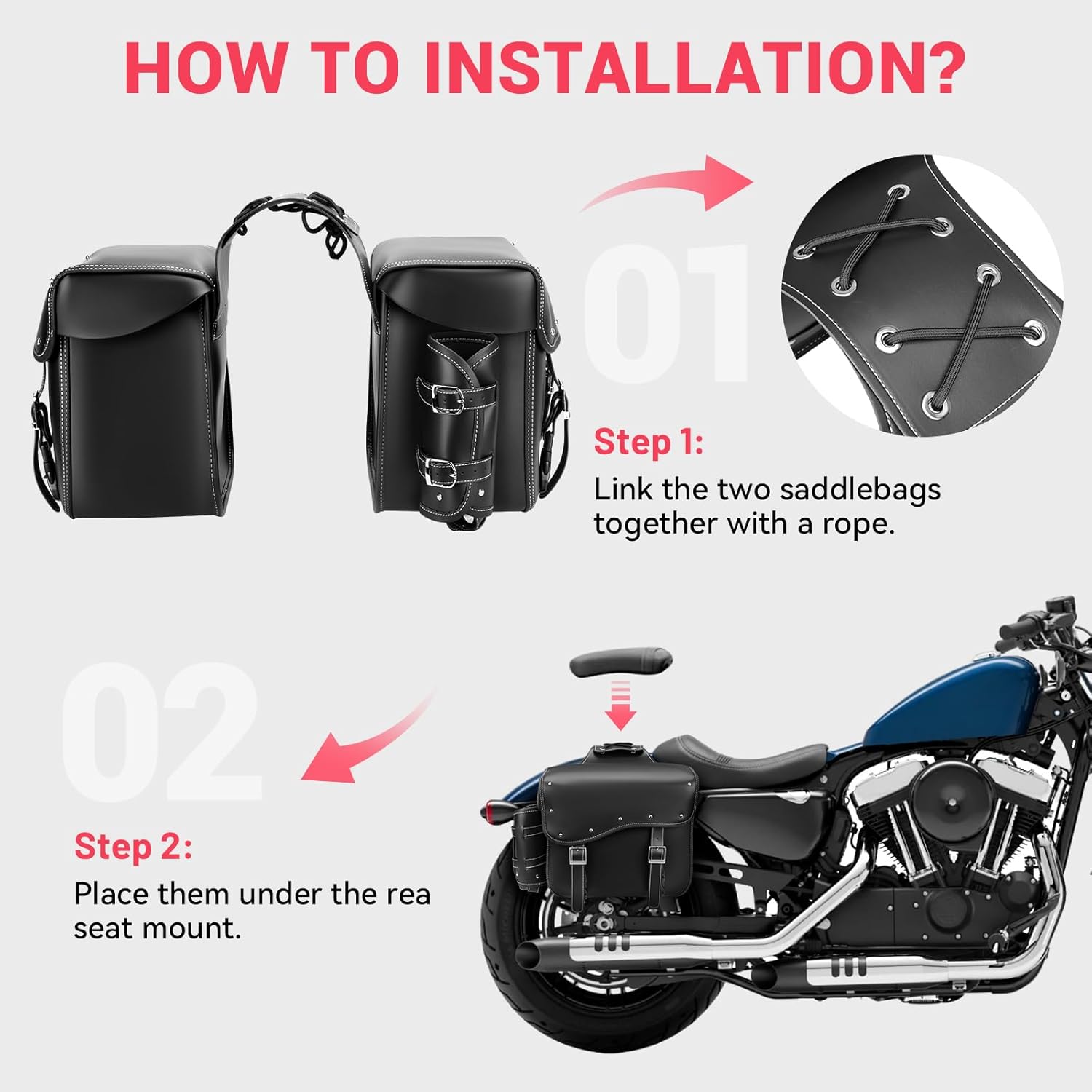 PREMIUM FABRIC: These motorcycle saddlebags waterproof are designed with high-quality integrated high-density PU leather, which not only prevents deformation but also provides excellent waterproof and rainproof protection. Compared to traditional canvas saddle bags for motorcycles, they will not sag even when the bag is completely empty.